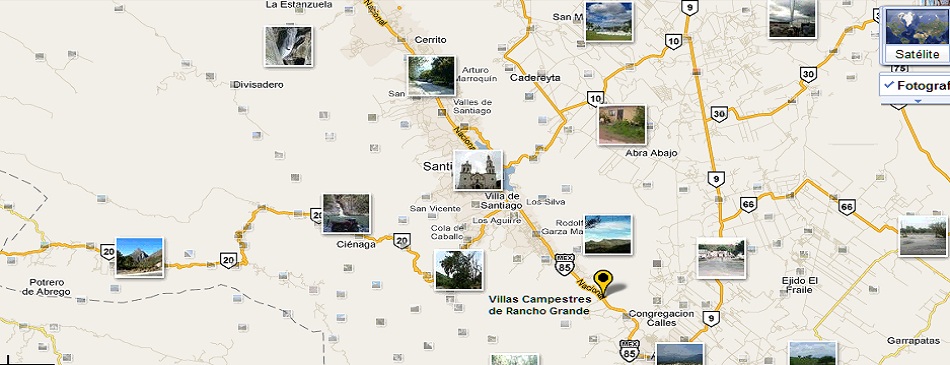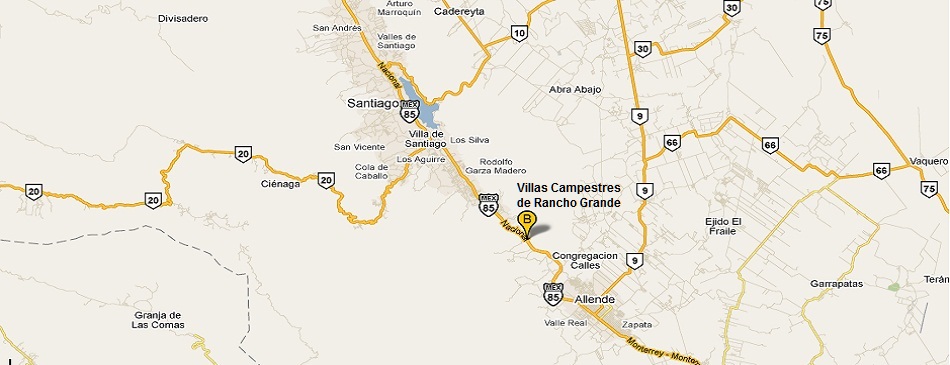 MAPA DE UBICACION Las Villas campestres de rancho grande se encuentra ubicada a 40 minutos de monterrey NL por la carretera nacional en el kilometro 235.3 a 7 km adelante del alamo rumbo al sur(ver mapas arriba)